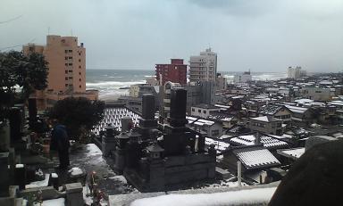 高台にあるお寺からは、日本海の様子も湯野浜の様子も一望。