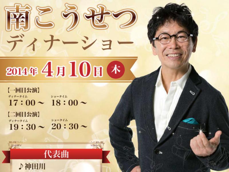 南こうせつディナーショー開催いたします!S席、A席、B席、各席ご予約いただいたお客様より順に、席順をきめさせて頂きます。■南こうせつディナーショー開催♪代表曲・神田川 ・妹 ・夢一夜etc...日時:2014年4月10日(木)※どちらの公演を希望がお知らせ下さい。一回目公演:17:00〜(ディナータイム)、18:00〜(ショータイム)二回目公演:19:30〜(ディナータイム)、20:30〜(ショータイム)チケットのみ販売S席:26,000円A席:23,000円B席:20,000円■■■宿泊ご希望の場合はお一人様+6,000円にて…■■■ディナーショーにご参加のお客様限定。お部屋の種類はおまかせになります。1泊朝食付きでお一人様6,000円となります。プラン詳細はこちらhttp://www.489pro.com/asp/489/menu.asp?id=06000010&gp=YES&ty=lim&group=50-------------------------------------------------山形県かみのやま温泉 日本の宿古窯 公式ホームページ /旅館古窯公式Facebookページ:http://www.facebook.com/ryokan.koyo