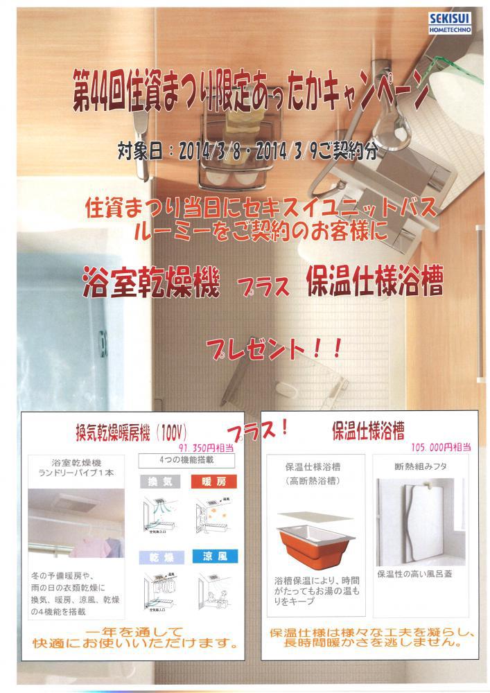 ツイッターで告知していましたとおり、毎年恒例☆住資まつりの時期がやって参りました!  ☆ 2014年 第44回住資まつり ☆日時: 平成26年3月8日(土)〜9日(日)     AM10:00〜オープン!開催場所: 山形県観光物産会館 (山形市蔵王68番地) ユニットバス・システムキッチン・トイレ・洗面化粧台じゃんじゃん展示しております!こちらに添付した画像のとおり、ユニットバスは今がお得です ヽ(*´∀`)ノ 住資まつり当日にセキスイユニットバス ルーミー をご契約してくださったお客様に 浴室乾燥機(91,350円相当)   と  保温仕様浴槽(105,000円相当) を プレゼント しております!!合わせると・・・196,350円相当!!ひえ〜ヽ( ゚д゚)ノ   他にもたくさん展示品はございますので、お気軽にお越し下さい ^^今のお風呂ってどういう感じか気になるわ〜というお客様もいらっしゃるかと思います。ご自身の目でお確かめ頂くだけでももちろん結構です^^*是非 是非 、ご家族の方もお誘いのうえお気軽にいらしてくださいませ♪カタログで品物を見るのと、実際に実物の品物を見るのは、やはり違いますからねっ♪ 暖かいお飲み物や粗品をご用意して、   皆様のご来店を心よりお待ちしております \(^^)/