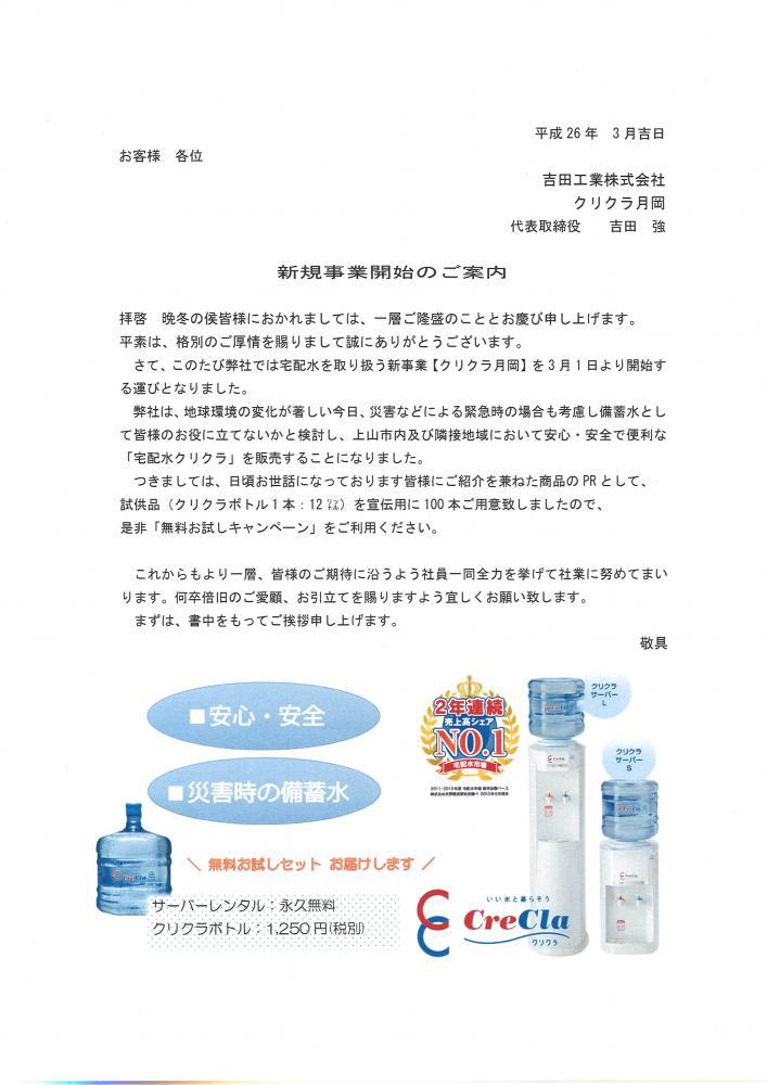 本日は皆様にご報告がございます。この度新たな事業として、宅配水を取り扱う《 クリクラ月岡 》を本日より開始する運びとなりました。詳細は添付したとおりとなっておりますので末永いお付き合いの程よろしくお願い申し上げます。 という堅苦しい文章はここまでにしてーー、 ヽ(´▽`)/そうです、昨日こそ!この記事を投稿したかったのですが、書き綴った文が全て消えてしまってご報告が本日となってしまいました (^^;)笑記事を書き終えたら、「投稿」をクリックする前に Ctrl + 「c」 で念のため、コピーをしておいた方がよさそうです (*´∀`)b 気をつけねば><話を戻して・・・、試供品クリクラボトル1本(12リットル)飲んでいただける、無料お試しキャンペーンも実施しておりますので、よかったら一度使ってみてくださいね♪ 最近私は、お水か白湯を飲むようになって(お茶好きですが胃に負荷が!笑)水に興味を持った私は、友達もお水を飲んでるのか聞いてみました。そしたら、「水飲むよー 」という答え意外な答えが!ショップ店員さんとの話がはずみ、たまたま水の話になったときも、 ショップ店員さん「 水も飲みますけど最近は炭酸水も飲みますね 」ええー!炭酸水も飲めるんだ!私は炭酸水といったら、カクテルと割る時だけ・・\(^^)/ 水って飲む人は飲むんだなーと思いましたビックリしました!当の本人も、水なんて絶対無理!の一人でした (;´ω`) お弁当開きは絶対麦茶でしょ!的なですね(笑)それが今では、 友:「お茶飲むー?」 私:「ありがとう、とりあえず、水で。」 ですからね〜 (^O^) 何があったんだか(笑)なんで水が好きになったのかなー、 水の魅力って何なんでしょうね〜?これからお水のこと色々勉強しないとです (`・ω・´) というわけで、あ!本業は住宅リフォームや水道設備業ですので!^^水回りでお困りの方はお気軽にご連絡ください!笑今後ともどうぞよろしくお願い致します o(^▽^)o