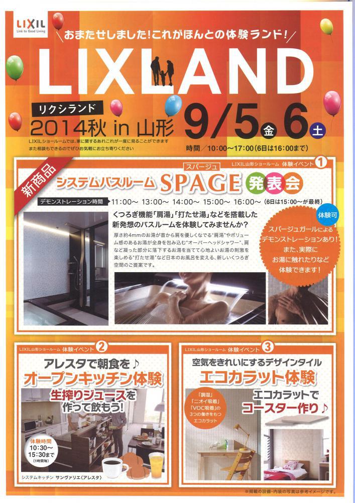 みなさんおはようございます(^0^) 山形市では8月5・6・7日と、賑やかな花笠まつり 開催中ですね〜♪ 午後から雨が降らなければ本日最終日☆行ってみようかなと 思っています (`・ω・´)♪  というわけでまだまだ連日暑い日が続きますが、秋のイベントのお知らせです! 9/5(金)、 6(土) の二日間 10:00〜17:00 (6日は16:00まで)LIXILショールーム(山形市城西町4-27-33) にて  LIXLAND リクシランド   が開催されます!! ご成約いただきますと、もれなくプレゼントがもらえます(o^^o)詳しくは上記に添付しましたチラシをご覧下さい♪