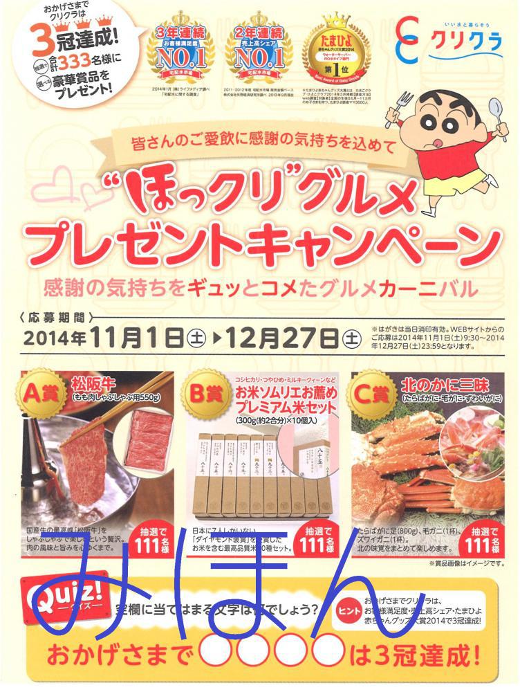 いつもクリクラをご愛飲頂きまして誠にありがとうございます。この度、皆さんのご愛飲に感謝の気持ちを込めて抽選でプレゼントが当たる企画を準備致しました。  その名も・・・”ほっクリ”グルメプレゼントキャンペーン    にご応募頂けます♪  今月からクレヨンしんちゃんがクリクラの歌を歌っているあのCMです(^O^)もうご覧になりましたか?   応募期間は11月1日(土)〜12月27日(土)まで!  応募ハガキに記載してある簡単な(笑)クイズに答えて☆切手を貼って☆ポストに入れるだけ☆  ご愛飲の皆様には・・・・お水の配達時に、応募ハガキ一緒にをお配りしております!これからお配りするお客様もいらっしゃいますのでもうしばらくお待ちください  ヽ(´▽`)/皆様のご応募お待ちしております (^0^)/    そして!これからクリクラを飲んでみたい!宅配水ってどういうお水?という方は・・・ クリクラ無料お試しキャンペーン実施中!!  クリクラボトル1本 12リットル        +  クリクラサーバー 1台 上記の無料お試しセットをお届け致します☆    以前より上山市のクリクラご愛飲のお客様も増えてきているようですし、 「よくお医者さんでお水を見かけては飲んでるよ」と、お客様からお声を頂くことも・・・(*^o^*) 最近、宅配水に関するお客様のご興味や反応も多くなってきいる気がします。   少しずつ上山市民の皆さんにも宅配水のクリクラを知っていただけたらという思いで無料お試しセットをお配りしておりますのでどうぞお気軽にお使いください♪