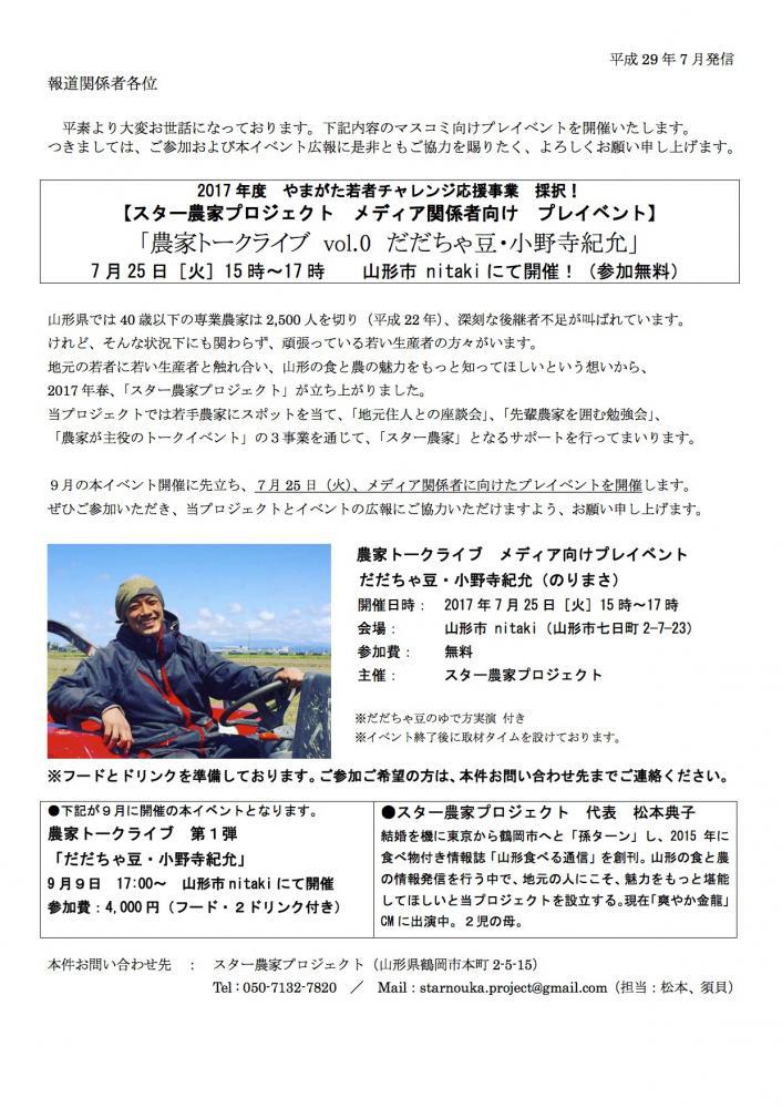 平成29年6月より、スター農家プロジェクトが始動しました!◆スター農家プロジェクトとは??◆県内の若手農家さんにスポットを当て、「地元住民との座談会」「先輩農家を囲む座談会」「農家が主役のトークイベント」の3事業を展開していきます。今回、その中の「農家が主役のトークイベント」のプレイベントの参加者を募集します。9月の本イベントに向けて一緒に、このプロジェクトを応援してくださる方、一緒に盛り上げてくださる方、大歓迎です。■日時:2017/7/25(火)15:00〜17:00■場所:山形市 nitaki (山形市七日町2-7-23)■参加費:無料■申込方法:starnouka.project@gmail.com 迄メールにてお申込ください。 (担当:松本・須貝)