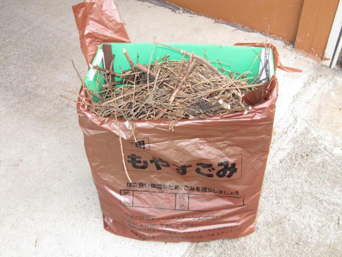 剪定した枝を指定ゴミ袋へ入れています。こんな感じの枝があります。苅込バサミと太枝切バサミでこのように細かく切る。こんな感じになりました。自作のゴミ袋カバーです。 指定ゴミ袋を逆さにしてかぶせます。こうなります。ゴミ袋をカバーの外側にするというのは、枝の先で破れない様にするため。中はこんな感じです。底はありません。先ほどの枝を入れると1/3くらいしかなりません。なので、もっと足します。このくらいが適量です。上からギューギュー押しながら入れています。カバーを上に引き上げてはずします。枝が袋に突き刺さらずきれいに入っています。