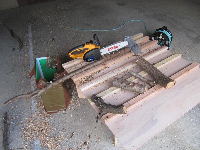 先日までの剪定した枝の処理、第一部ということで剪定バサミ、太枝切バサミで処理できる枝の処分が終わったので、第二部に入ります。山盛りになった太い枝を、先日購入した電動チェーンソー[RYOBI CS2501]で細かく解体です。作業台は自作です。90p角のベニヤ板に角材を、間隔を徐々に広げながら固定しました。チェーンソーで切るとき枝が移動しないように固定するためです。間隔を徐々に広げたのは、各枝の太さに対応するためです。又、角材には10p間隔でラインを入れています。太枝などを切断するとき、40p以内に切ると茶色ゴミ袋に入ります。 結構木くずがでます。 こんな太い木は 細かくします。比較的まっすぐなところは40センチに切っておきます。 比較的まっすぐな木は40センチに切って敷いておきます。 最初なので少なくなったのわかるかな?