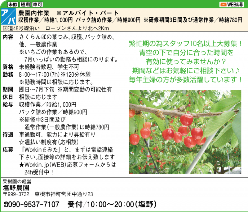 さくらんぼの葉つみ、収穫、パック詰めなどの農作業。・収穫作業/時給1,000円・パック詰め作業/時給 900円☆車通勤可、能力により昇給有ります。☆週払い制度有ります。(応相談)☆いちご作業もあるため、7月いっぱいの勤務も相談にのります。塩野農園TEL. 090-9537-7107受付:塩野(しおの)まで 10:00-20:00→ WEBからのお問合せはこちらからどうぞ。