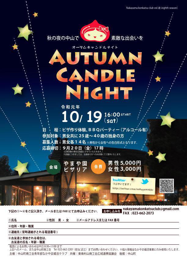 AUTUMN CANDLE NIGHT(オータムキャンドルナイト)〜秋の夜の中山で素敵な出会いを〜中山町商工会青年部なかやま婚活クラブが開催し、毎回大好評の婚活イベントが今年も開催!!2019年10月19日(土)16:00スタート日 程:ピザ作り体験、BBQパーティー(アルコール有)参加対象:男女共に25歳〜40歳の独身の方募集人数:男女各14名 ※男性から女性への告白形式となります。応募締切:9月20日(金)17時 応募多数の場合は抽選とさせていただきます。 ※詳細につきましては、当選者の方へのみ封書でご案内します。会 場:やまや園 ピザリア料 金:男性 5,000円、女性 3,000円お問合先:中山町商工会 TEL 023-662-2207 FAX 023-662-2073