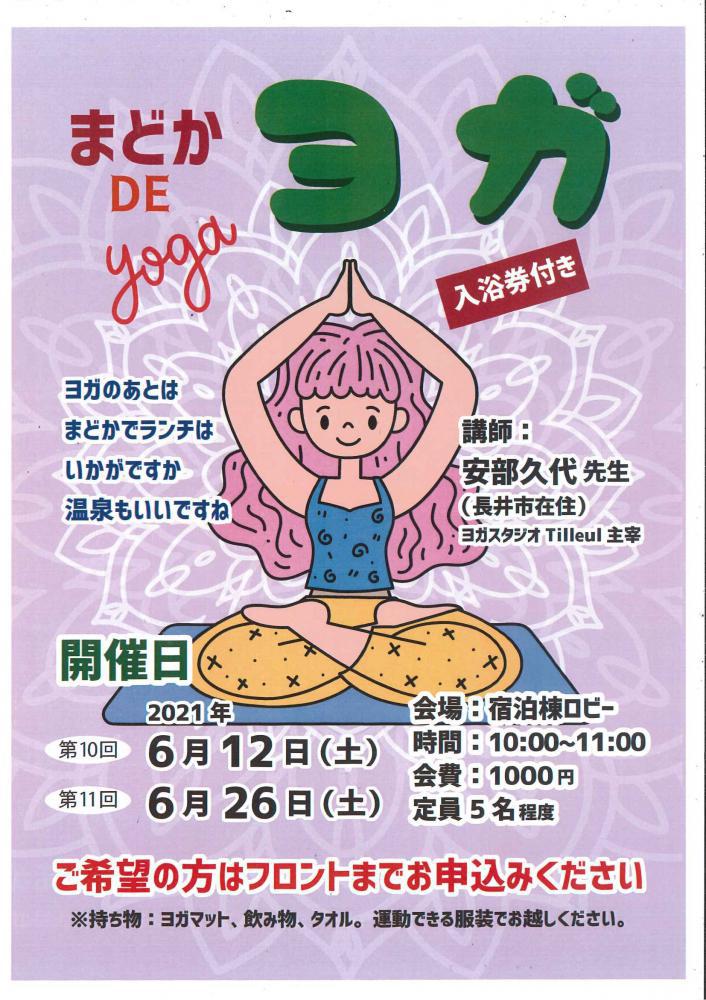 まどかDEヨガ5月の日程です!!ヨガでリフレッシュして、ヨガの後はまどかでランチはいかがですか?温泉もいいですね♪2021年5月22日(土) 会場:まどか宿泊棟ロビー時間:10:00〜11:00会費:1,000円定員:5名持ち物:ヨガマット・飲み物・タオル・運動できる服装でお越し下さい。※ご希望の方は、まどかフロントまでお申込み下さい。