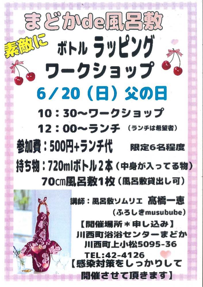 風呂敷ワークショップ6月20日(日)父の日ボトルラッピングワークショップ10:30〜ワークショップ12:00〜ランチ(ランチは希望者のみ別料金)参加費:500円+ランチ代定 員:6名程度持ち物:720mlボトル2本(中身が入っているもの) 70cm風呂敷1枚(風呂敷貸出し・購入可)講師:風呂敷ソムリエ 煖エ一恵開催場所:まどか会議室お申込みはまどかまで TEL0238-42-4126※感染症対策しっかりさせていただき開催いたします!