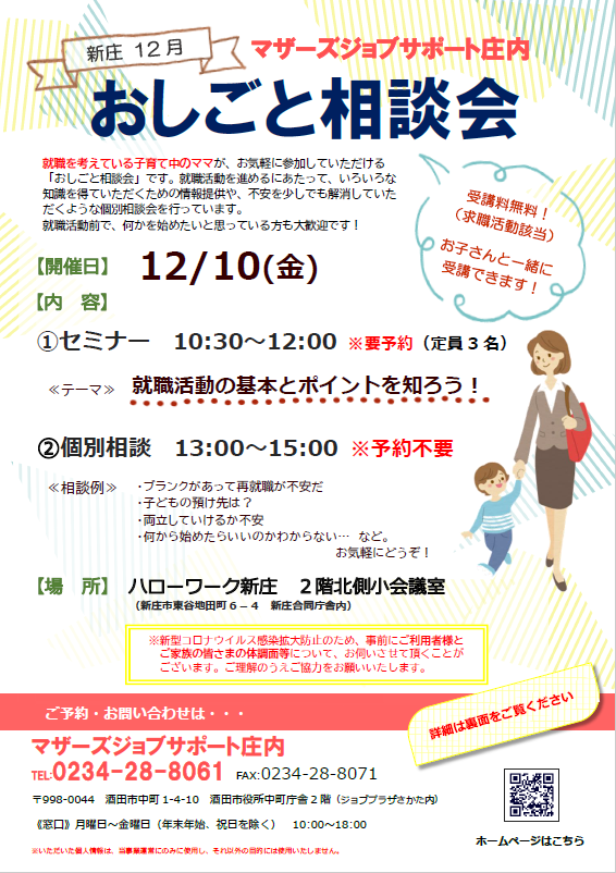ハローワーク新庄『おしごと相談会』を開催します。※2階南側小会議室に場所が変更になりました。 【日時と内容】12月10日(金)10:30〜12:00 セミナー ※お申込みが必要です。「就職活動の基本とポイント」ハローワークの職員を講師に招いてのセミナーです。求人票を見る時のポイントや書類の書き方、面接の受け方など、具体的な話を聞いて、仕事復帰のヒントを一緒に見つけてみませんか? 13:00〜15:00 個別相談会※どなたでもご利用いただけますお申込みは不要です。・おしごとに関するお悩み・子育てに関すること・仕事と家事、子育てとの両立 など、お気軽にご相談ください。 ♪お子さんと一緒に、お気軽にお越しください♪お子さんと同じお部屋でセミナーを受講し、相談することができます。保育スタッフが、ママをサポートします。 ★★受講者の皆様へお願い★★新型コロナウイルス拡大防止のため、・入室時の検温・手指の消毒・会場でのマスク着用・距離をとっての対応・定期的な換気にご協力お願いいたします。★★ーーーーーーーーーーーー★★ お問い合わせはマザーズジョブサポート庄内TEL:0234-28-8061メールでのお申込みはコチラ
