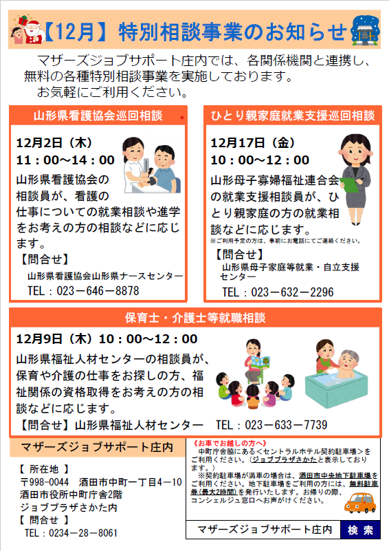 マザーズジョブサポート庄内では、各関係機関と連携し、各種特別相談事業を実施しております。ぜひ、ご利用ください。 山形県看護協会巡回相談 ※お申し込み不要日 時 12月2日(木)11:00〜14:00場 所 マザーズジョブサポート庄内 セミナールーム問合せ 山形県看護協会 пF023-646-8878HP:http://www.nurse-yamagata.or.jp/ 看護の仕事への復職をお考えの方、お気軽にご相談ください。 保育士・介護士等就職相談 ※お申し込み不要日 時 12月9日(木)10:00〜12:00場 所 マザーズジョブサポート庄内 セミナールーム問合せ 山形県福祉人材センター пF023-633-7739HP:http://www.ymgt-shakyo.or.jp/jinzai/保育士・介護士・看護師など資格をお持ちの方や、資格取得を目指している方、福祉職にご関心のある方は、お気軽にお越しください。 ひとり親家庭就業支援相談 [要予約]日 時 12月17日(金)10:00〜12:00場 所 お電話・Zoomを使用しオンラインでの相談問合せ 山形県母子家庭等就業・自立支援センター пF023-632-2296HP:http://www.y-boshi.com/self-support/ひとり親家庭の方や今後について考えている方、どうぞお気軽にご相談ください。※新型コロナウイルス感染拡大防止のため、 しばらくの間お電話やZoomを利用し オンラインでのご相談となります。 ※各相談会について、利用ご希望の方は、マザーズジョブサポート庄内までお気軽にお声掛けください。※ご相談の際、お子さまの託児は『保育ルーム きらきら』をご利用いただけます。託児ルームのご利用には、事前のご登録が必要です。 【駐車場について】お車でお越しの際は、中町庁舎脇にある〈セントラルホテル契約駐車場〉をご利用ください。(ジョブプラザさかたと表示してあります。)※契約駐車場が満車の場合は、酒田市中央地下駐車場をご利用ください。無料駐車券(最大2時間)を発行いたします。お帰りの際に、コンシェルジュ窓口へお声がけください。 ◇お申込み・お問い合わせ◇マザーズジョブサポート庄内TEL:0234-28-8061