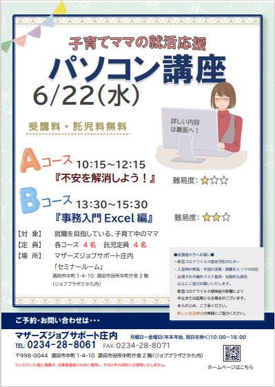 ☆マザーズジョブサポート庄内主催☆ 〜満員御礼〜 A・Bコースとも定員となりました。 ありがとうございます。 キャンセル待ちは受付しておりますので 電話でお問い合わせください。再就職応援『パソコン講座』のお知らせ ≪Aコース≫ 6月22日(水)10:15〜12:15『不安を解消しよう!』難易度:★「求人票の"パソコンが使える方"ってどの程度?」「仕事では、どのくらいのスキルが求められるの?」「WordとExcelって、どの程度使えると大丈夫?」などいろいろな不安がありますよね… パソコンについての"これから"を考えるきっかけに♪ ≪Bコース≫ 6月22日(水)13:30〜15:30『事務入門(Excel編)』難易度:★★事務のお仕事にも、一般・経理・労務など様々です。それぞれどのようなパソコン作業があるのかを確認していきます。実際にエクセルで、関数を利用し請求書を作成します。 ♪片方のコースのみ、両方のコース、どちらの受講でも可能です♪※本セミナーは「雇用保険受給中の求職活動実績」として認められます。 ★★受講者の皆様へお願い★★新型コロナウイルス拡大防止のため、・入室時の検温・手指の消毒・距離をとっての対応・会場での不織布マスク着用・定期的な換気以上にご協力お願いいたします。新型コロナウイルス感染症の影響により中止または延期となる場合がございます。あらかじめ、ご了承ください。新しい生活様式の実践にご協力ください。★★ーーーーーーーーーーーー★★【対 象】就職を目指している子育て中のママ※就職活動前で何かを始めたいママもOK【会 場】マザーズジョブサポート庄内 セミナールーム【料 金】受講料 及び 託児料 無料【定 員】先着4名 ※お申込みが必要です。【託 児】定員4名 ※事前登録・予約が必要です。 保育ルーム開室日、水・木・金の 16:00までに登録にお越し下さい。※併設の保育ルームで、保育スタッフが お子さんをお預かりします。 ママは安心して受講いただけます。 【駐車場について】お車でお越しの際は、中町庁舎脇にあるセントラルホテル契約駐車場をご利用ください。(ジョブプラザさかたと表示してあります。)※契約駐車場が満車の場合は、酒田市中央地下駐車場をご利用ください。無料駐車券(最大2時間)を発行いたします。お帰りの際に、コンシェルジュ窓口へお声がけください。 ◇お申込み・お問い合わせ◇マザーズジョブサポート庄内TEL:0234-28-8061