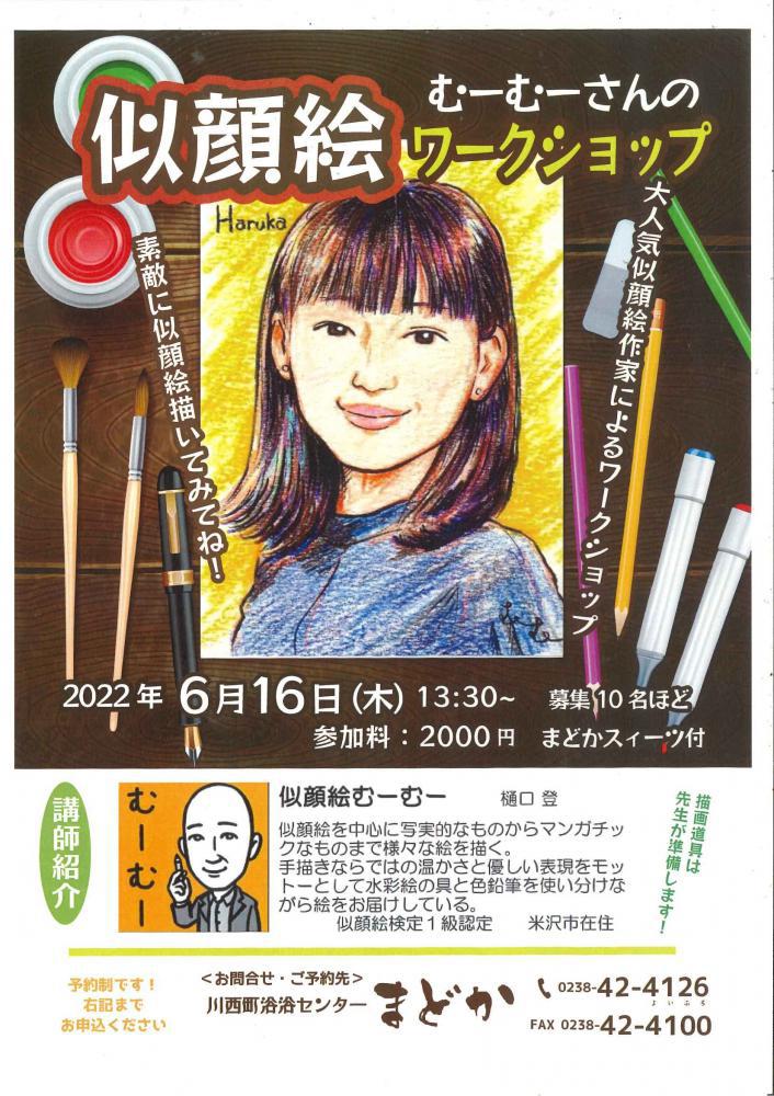 むーむーさんの似顔絵ワークショップ開催〜大人気似顔絵作家によるワークショップ〜2020.6月16日(木)13:30〜まどか会議室●参加料:2,000円(まどかスイーツ付)●募集人員:10名ほど※描画道具は先生が準備します皆さん素敵に描いてみてね♪※予約制です。浴浴センター まどか Tel0238-42-4126まで お申込み下さい