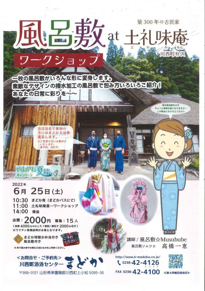 2022.6月25日(土)風呂敷at土礼味庵ワークショップ開催一枚の風呂敷が色んな形に変身します。素敵なデザインの撥水風呂敷を使って、水筒やペットボトルの包み方をを紹介!これから夏、持ち歩く時の便利な使い方をみんなで、習いましょう♪日時2022.6月25日(土)10:30 まどか発(まどかのバスにて移動)11:00 土礼味庵着〜風呂敷ワークショップ〜14:00 帰途会費:2,000円 (実質4000円の所「夏旅CP割引」2,000円引き)※参加者はワクチン接種証明が必須となります。ご持参下さい。※まどか特製弁当付き、素敵な撥水風呂敷付き※水筒や、折り畳み傘など包むものご持参下さい。※募集人数15名(ご予約下さい)※篤実浴衣で参加の方には、まどか入浴券プレゼント!!※浴衣着付けも致します(500円)・・・要予約※浴衣レンタル(1,000円)もできます・・・要予約講師:=風呂敷ソムリエ:煖エ 一恵=築300年の古民家(川西朴沢)で、日常をはなれ静かな所で風呂敷ワークショップを楽しみ、また癒されませんか?