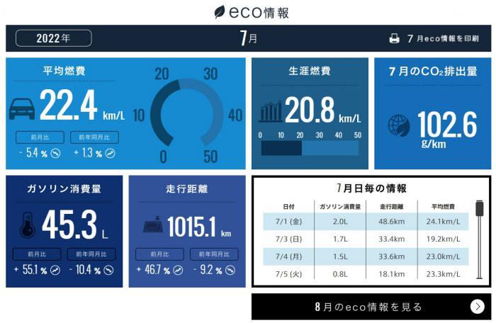 7月の燃費です。やはり猛暑でエアコンフル稼働だったので、燃費は少し悪化します。