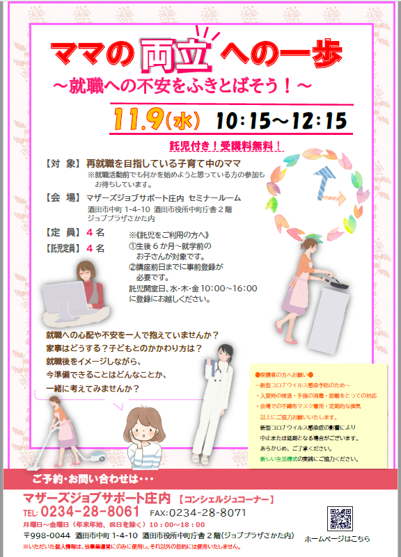 ☆マザーズジョブサポート庄内主催☆『ママの両立への一歩 〜就職への不安をふきとばそう!〜』 のお知らせです。 Zoomでも配信します! 就職への心配や不安を一人で抱えていませんか?家事はどうする?子どもとのかかわり方は?就職後をイメージしながら、今準備できることはどんなことか、一緒に考えてみませんか? 【日 時】11月9日(水)10時15分〜12時15分 【対 象】再就職を目指している子育て中のママ※就職活動前で何かを始めたい方でもOK【会 場】マザーズジョブサポート庄内 セミナールーム (酒田市中町1-4-10 酒田市役所中町庁舎2階)またはご自宅でオンライン受講(Zoom)【料 金】受講料 及び 託児料 無料【定 員】 @セミナールームでの受講(4名) Aオンラインでの受講(随時受け付けております) ※@の場合は託児もご利用いただけます。【託児】定員 4名 ※事前登録・予約が必要です 保育ルーム開室日【水・木・金】の 10:00〜16:00に登録にお越し下さい。 ※併設の保育ルームで、保育スタッフが お子さんをお預かりします。 ママは安心して受講いただけます。 【駐車場について】お車でお越しの際は、中町庁舎脇にあるセントラルホテル契約駐車場をご利用ください。(ジョブプラザさかたと表示してあります。)※契約駐車場が満車の場合は、 酒田市中央地下駐車場をご利用ください。 無料駐車券(最大2時間)を発行いたします。 ★★受講者の皆様へお願い★★〜新型コロナウイルス感染予防のため〜・入室時の検温・手指の消毒・距離をとっての対応・会場での不織布マスク着用・定期的な換気 以上にご協力お願いいたします。 新型コロナウイルス感染症の影響により 中止または延期となる場合がございます。 あらかじめ、ご了承ください。 新しい生活様式の実践にご協力ください。★★ーーーーーーーーーーーー★★●ご自宅でオンライン受講ご利用の方へ●・インターネット環境が必要になります 通信料は自己負担です・パソコン、スマートフォン、 タブレットをご準備いただき、 事前にZoom meetingを ダウンロードしてください・セミナー中はカメラをオンにし、 お顔のみえる状態で受講して下さい●ーーーーーーーーーーーーーーーーーー●どうぞ、お気軽にお問い合わせくださいね。 ◇お申込み・お問合せ◇マザーズジョブサポート庄内TEL:0234-28-8061メールでのお申込みはコチラ
