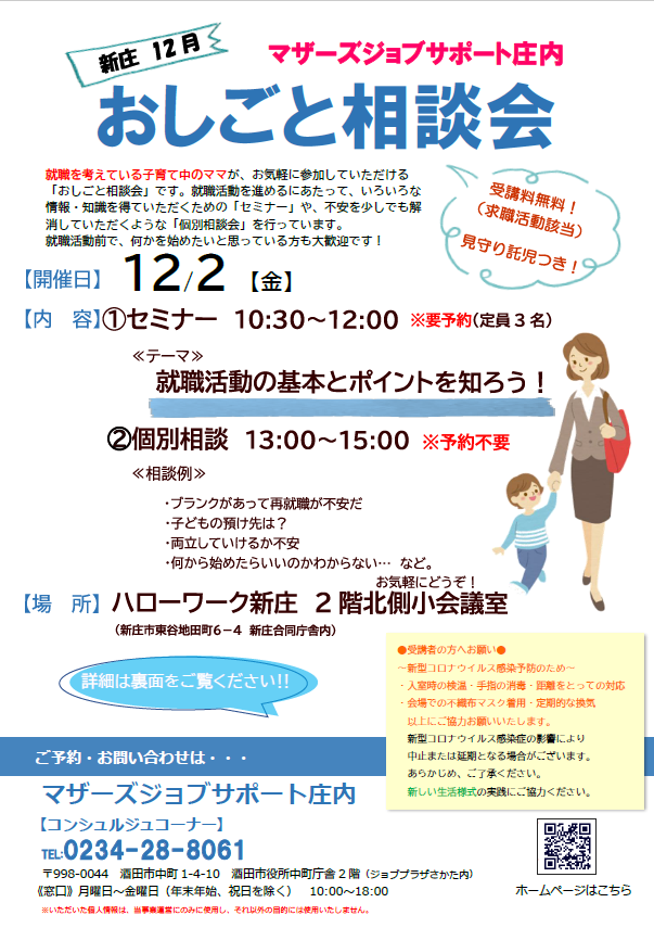 ハローワーク新庄『おしごと相談会』を開催します。 【日時と内容】■ 12月2日(金)10:30〜12:00 セミナー ※お申込みが必要です。「就職活動の基本とポイントを知ろう」ハローワークの職員を講師に招いてのセミナーです。求人票を見る時のポイントや書類の書き方、面接の受け方など、具体的な話を聞いて、仕事復帰のヒントを一緒に見つけてみませんか? 13:00〜15:00 個別相談会※どなたでもご利用いただけますお申込みは不要です。・おしごとに関するお悩み・子育てに関すること・仕事と家事、子育てとの両立 など、お気軽にご相談ください。 ♪お子さんと一緒に、お気軽にお越しください♪お子さんと同じお部屋でセミナーを受講し、相談することができます。保育スタッフが、ママをサポートいたします。 ★★受講者の皆様へお願い★★〜新型コロナウイルス感染予防のため〜・入室時の検温・手指の消毒・距離をとっての対応・会場での不織布マスク着用・定期的な換気以上にご協力お願いいたします。新型コロナウイルス感染症の影響により中止または延期となる場合がございます。あらかじめ、ご了承ください。新しい生活様式の実践にご協力ください。★★ーーーーーーーーーーーーーー★★ お問い合わせはマザーズジョブサポート庄内TEL:0234-28-8061メールでのお申込みはコチラ