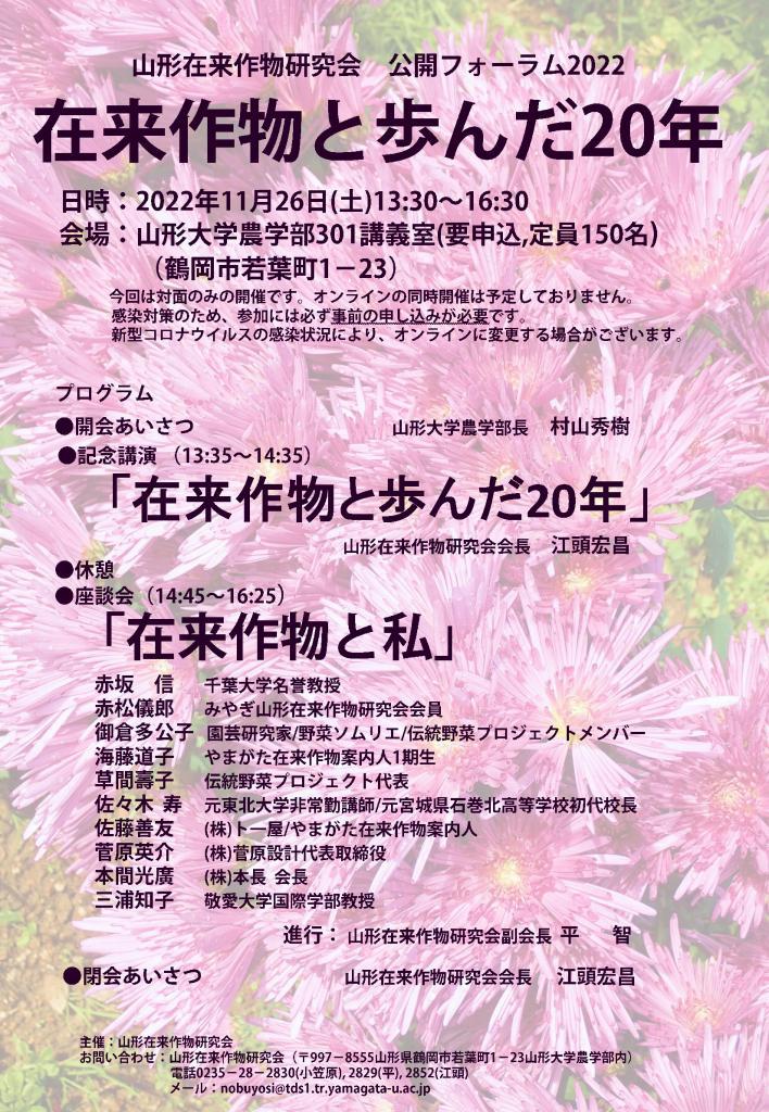 ※対面で開催の予定ですが、対面が中止の場合はご連絡します、連絡がない場合は対面開催です。以下の要領で公開フォーラムを開催します。参加は無料ですが、コロナ対策のため150人定員にしますので、予約が必要です。○テーマ: 「在来作物と歩んだ20年」○と き: 2022年11月26日(土)13:30〜16:30○ところ: 山形大学農学部301講義室(鶴岡市若葉町1−23) *今回は対面のみの開催です。オンラインの同時開催は予定しておりません。○日 程: ●在作研総会(13:00〜13:30)(302講義室)●公開フォーラム2022・開会あいさつ 山形大学農学部長 村山秀樹(13:30〜13:35) ・記念講演(13:35〜14:35)(60分) 「在来作物と歩んだ20年」 山形在来作物研究会会長 江頭宏昌・休憩(14:35〜14:45)(10分)・座談会(14:45〜16:25)(90分)「在来作物と私」 赤坂 信 千葉大学名誉教授 赤松儀郎 みやぎ在来作物研究会会員 御倉多公子 園芸研究家・伝統野菜プロジェクトメンバー 海藤道子 やまがた在来作物案内人1期生 草間壽子 伝統野菜プロジェクト代表 佐々木寿 元東北大学非常勤講師・元宮城県石卷北高等学校初代校長 佐藤善友 (株)ト一屋・やまがた在来作物案内人 菅原英介 (株)菅原設計代表取締役 本間光廣 (株)本長 会長 三浦知子 敬愛大学国際学部教授 進行:山形在来作物研究会副会長 平 智・閉会あいさつ (16:25〜16:30) 山形在来作物研究会会長 江頭宏昌主催:山形在来作物研究会お問い合わせ:山形在来作物研究会 事務局 0235-28-28230(小笠原)、2829(平)、2852(江頭)メール(在作研事務局:小笠原):nobuyosi@tds1.tr.yamagata-u.ac.jp @の前のsiはshiではなく、siなので注意申込は 下記の内容をFAX:0235-28-2812または上の在作研事務局(小笠原)のメールにておしらせ下さい。--------------------対面開催が中止になった場合は、オンラインで参加(する・しない)お名前(ふりがな)ご住所電話FAXまたはメールアドレスご職業----------------------------------なお関連行事として、 26日10:00〜は、鶴岡駅前のFOODEVERにて、「小さな小さな在来かぶサミット」という庄内と最上のカブを中心に展示・販売を行う催しがあります。 27日(日)14:30から、山形市の東ソーアリーナにてミュージカル「しあわせのタネ」の公演があります。2014年から各地で講演されてきたミュージカルですが、今年度でいよいよ終わりになるそうです。今年は山形市の蔵王かぼちゃがテーマ。今年も素晴らしい俳優さんたちが登場するそうで、感動的な舞台になりそうです。また澤田知可子さんも特別出演されるとか。