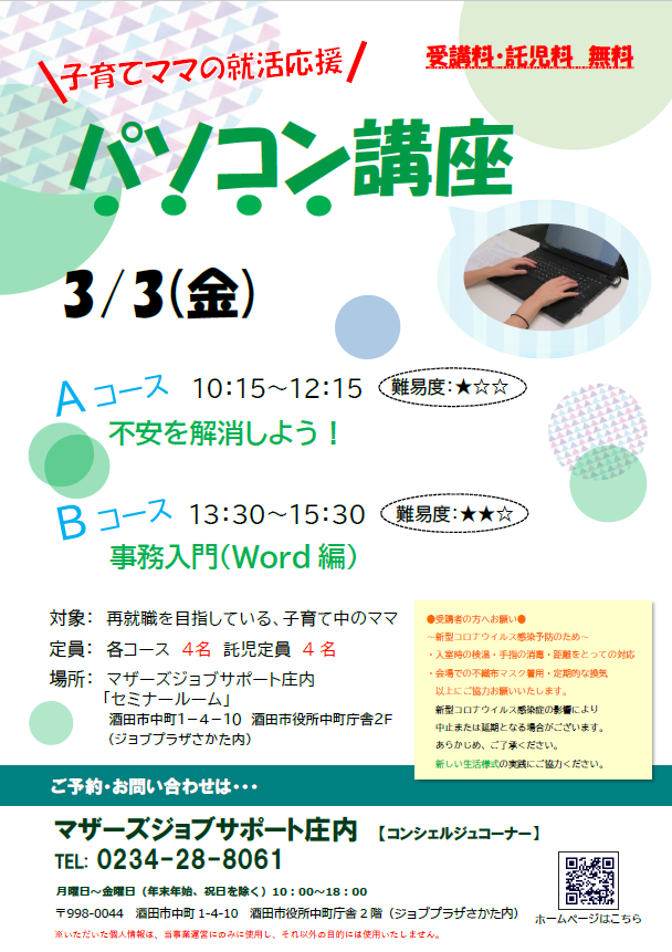 ☆マザーズジョブサポート庄内主催☆ 再就職応援『パソコン講座』のお知らせ A・Bコース満員御礼!※キャンセル待ちの お申込みは受付中です ◇3月◇≪Aコース≫ 3月3日(金)10:15〜12:15『不安を解消しよう!』仕事でのどの程度のパソコンスキルが必要とされるのかを確認し、差のつく基本操作について知ることができます。 ≪Bコース≫ 3月3日(金)13:30〜15:30『事務入門(Word編)』事務のお仕事といっても様々な種類があります。(一般事務、営業事務等)パソコンでそれぞれどのような作業があるのかを確認していきます。実際にWordを使ってビジネス文章を作成し、印刷まで行います。 ♪Aコースのみ、Bコースのみ、 A・B両コース、どの受講でも 可能です♪ 【対 象】就職を目指している子育て中のママ※就職活動前で何かを始めたいママもOK【会 場】マザーズジョブサポート庄内 セミナールーム【料 金】受講料 及び 託児料 無料【定 員】先着4名 ※お申込みが必要です。【託 児】定員4名 ※事前登録・予約が必要です。 保育ルーム開室日【水・木・金】の 10:00〜16:00に登録にお越し下さい。 ※併設の保育ルームで、保育スタッフが お子さんをお預かりします。 ママは安心して受講いただけます。 【駐車場について】お車でお越しの際は、中町庁舎脇にあるセントラルホテル契約駐車場をご利用ください。(ジョブプラザさかたと表示してあります。)※契約駐車場が満車の場合は、酒田市中央地下駐車場をご利用ください。無料駐車券(最大2時間)を発行いたします。お帰りの際に、コンシェルジュ窓口へお声がけください。 ★★受講者の皆様へお願い★★〜新型コロナウイルス感染予防のため〜・入室時の検温・手指の消毒・距離をとっての対応・会場での不織布マスク着用・定期的な換気 以上にご協力お願いいたします。 新型コロナウイルス感染症の影響により 中止または延期となる場合がございます。 あらかじめ、ご了承ください。 新しい生活様式の実践にご協力ください。★★ーーーーーーーーーーーー★★どうぞ、お気軽にお問い合わせくださいね。 ◇お申込み・お問い合わせ◇マザーズジョブサポート庄内TEL:0234-28-8061メールでのお申込みはコチラ