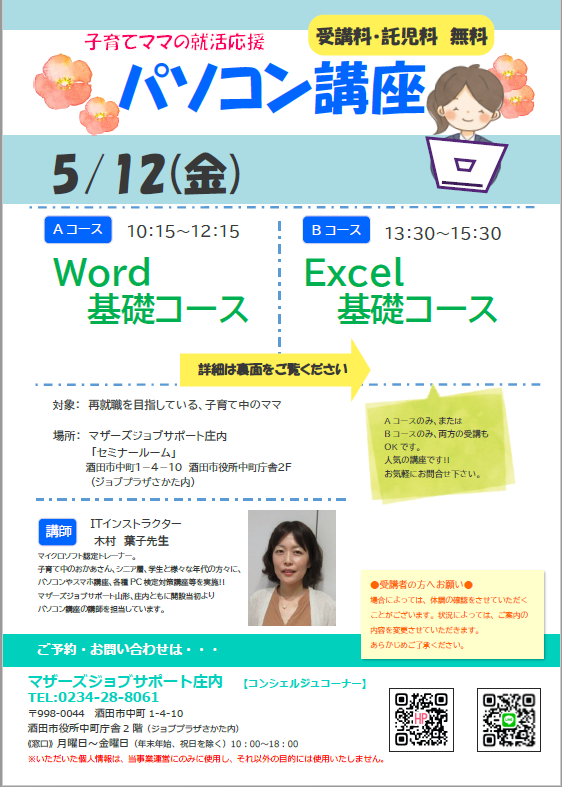 ☆マザーズジョブサポート庄内主催☆ 就活応援『パソコン講座』のお知らせ 満員御礼! A・Bコース※お申し込みいただいた方、 ありがとうございました。 当日お待ちしております。※キャンセル待ちでの受付は 行っております。 お気軽にお問合せください! ≪Aコース≫  5月12日(金)10:15〜12:15『Word基礎コース』 Wordを初めて使う方や,久しぶりの方を 対象に、基本的な機能と操作方法を お伝えします。 文字入力の仕方/文章の作成/表の作成 図形の作成などについて学べます。 たかが文字入力、されど文字入力 Wordの効率的な操作方法を学んでみませんか?  ≪Bコース≫5月12日(金)13:30〜15:30『Excel基礎コース』 Excelを初めて使う方や,久しぶりの方を 対象に、基本的な機能と操作方法を お伝えします。 表の作成/表の編集/関数による計算 グラフの作成/並べ替えなどについて学べます。 一緒に操作方法を学んでみませんか? ♪片方のコースのみ、両方のコース、どちらの受講でも可能です♪【対 象】就職を目指している子育て中のママ※就職活動前で何かを始めたいママもOK【会 場】マザーズジョブサポート庄内 セミナールーム【料 金】受講料 及び 託児料 無料【託 児】※事前登録・予約が必要です。保育ルーム開室日【水・木・金】の 10:00〜16:00に登録にお越し下さい。 ※併設の保育ルームで、保育スタッフが お子さんをお預かりします。 ママは安心して受講いただけます。 【駐車場について】お車でお越しの際は、中町庁舎脇にあるセントラルホテル契約駐車場をご利用ください。(ジョブプラザさかたと表示してあります。)※契約駐車場が満車の場合は、酒田市中央地下駐車場をご利用ください。無料駐車券(最大2時間)を発行いたします。お帰りの際に、コンシェルジュ窓口へお声がけください。 ★★受講者の皆様へお願い★★場合によっては、体調の確認をさせていただくことがございます。状況によっては、ご案内の変更をさせていただきます。あらかじめご了承ください。★★ーーーーーーーーーーーー★★どうぞ、お気軽にお問い合わせくださいね。 ◇お申込み・お問い合わせ◇マザーズジョブサポート庄内TEL:0234-28-8061メールでのお申込みはコチラ