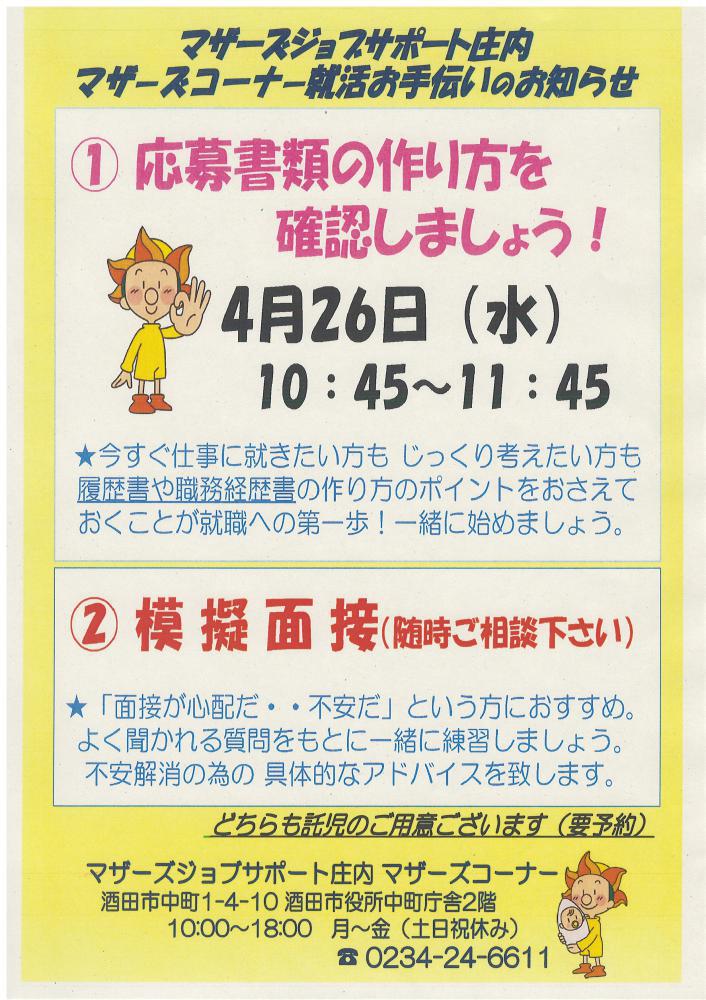 4月 マザーズジョブサポート庄内 マザーズハローワークコーナー @求職支援セミナー 『応募書類の作り方 確認しましょう!』 を行います! このセミナーは就職への第一歩! 履歴書・職務経歴書のポイント をお伝えします。 A模擬面接 ご希望に合わせ随時お受けいたします。 面接が久しぶりな方や苦手意識がある方に 特におすすめ、よくある質問をもとに練習し 具体的なアドバイスを致します。 ハローワークマザーズコーナーでは 定期的にセミナーを開催します。 奮ってご参加下さい。 受講後も疑問点など、 窓口にてご相談が受けられます。 【日 時】 4月26日(水) 10時45分〜11時45分【対 象】 お仕事探し中の子育てママさん【会 場】 マザーズジョブサポート庄内 セミナールーム【料 金】 受講料 及び 託児料 無料【定 員】先着3名 ※お申込みが必要です。【託 児】定員3名 ※事前登録・予約が必要です。 ※併設の保育ルームで、保育スタッフが お子さんをお預かりします。 ママは安心して受講いただけます。 【駐車場について】 お車でお越しの際は、中町庁舎脇にある セントラルホテル契約駐車場をご利用ください。(ジョブプラザさかたと表示してあります。) ※契約駐車場が満車の場合は、 酒田市中央地下駐車場をご利用ください。 ご利用の方は、無料駐車券を(最大2時間) を発行いたします。 お帰りの際に、マザーズコーナー窓口へお声がけください。 どうぞ、お気軽にお問い合わせくださいね。 ◇お申込み・お問い合わせ◇ マザーズジョブサポート庄内 TEL:0234-24-6611(ハローワークマザーズコーナー) TEL:0234-28-8061(コンシェルジュコーナー)