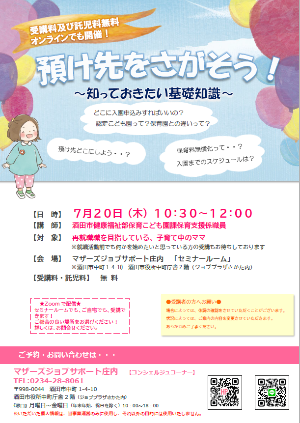 預け先をさがそう!〜知っておきたい基礎知識〜「そろそろ子どもを預けて仕事を始めようかな…」「預け先はどこにしたらいいんだろう?」  そんなママにおすすめのセミナーです。幼稚園や保育園の違い、預け先の探し方、申込み方法や入園までのスケジュールについて酒田市子育て支援課の職員の方からお話を聞くことができます。早めに情報をあつめて、仕事を始める準備をしてみませんか? 【日時】7月20日(木)10:30〜12:00【対象】就職を目指している子育て中のママ※就職活動前で何かを始めたい方でもOK 【会場】マザーズジョブサポート庄内 セミナールーム        (酒田市中町1-4-10 酒田市役所中町庁舎2階)       またはご自宅でオンライン受講(Zoom) 【料金】受講料 及び 託児料 無料 【定員】@セミナールームでの受講Aオンラインでの受講(随時受け付けております)※@の場合は託児もご利用いただけます。【託児】 ※事前登録・予約が必要です   保育ルーム開室日【水・木・金】の10:00〜16:00に登録にお越し下さい。 ※併設の保育ルームで、保育スタッフが お子さんをお預かりします。 ママは安心して受講いただけます。 ★★受講者の皆様へお願い★★場合によっては、体調の確認をさせていただくことがございます。状況によっては、ご案内の変更をさせていただきます。あらかじめご了承ください。★★ーーーーーーーーーーーー★★【駐車場について】   お車でお越しの際は、中町庁舎脇にある   セントラルホテル契約駐車場をご利用ください。(『ジョブプラザさかた』と表示してあります。)      ※契約駐車場が満車の場合は、 酒田市中央地下駐車場をご利用ください。 地下駐車場をご利用の方は、   無料駐車券(最大2時間)を発行いたします。   お帰りの際にコンシェルジュ窓口へお声がけください。どうぞ、お気軽にお問い合わせくださいね。◇お申込み・お問い合わせ◇マザーズジョブサポート庄内TEL:0234-28-8061メールでのお申込みはコチラ
