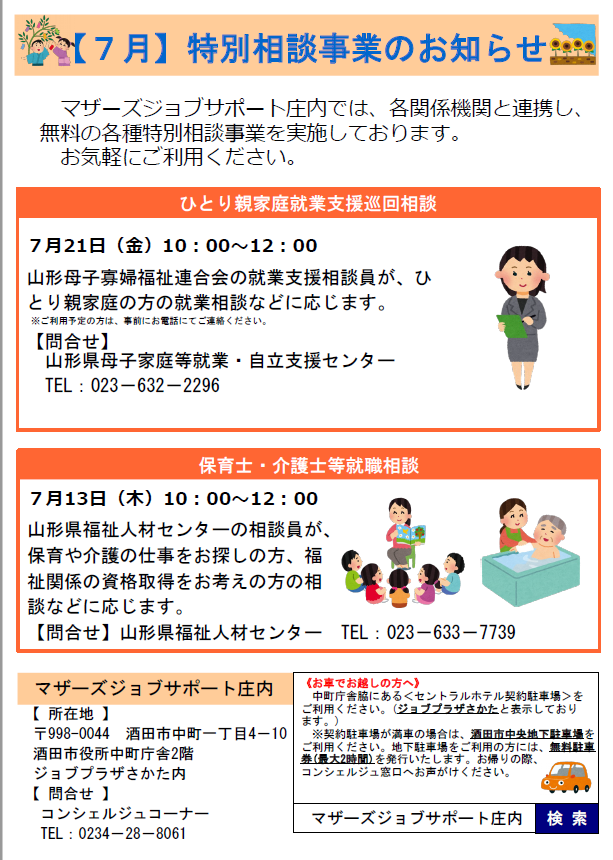 マザーズジョブサポート庄内では、各関係機関と連携し、各種特別相談事業を実施しております。ぜひ、ご利用ください。 保育士・介護士等就職相談 ※お申し込み不要日 時 7月13日(木)10:00〜12:00場 所 マザーズジョブサポート庄内 セミナールーム問合せ 山形県福祉人材センター пF023-633-7739HP:http://www.ymgt-shakyo.or.jp/jinzai/保育士・介護士・看護師など資格をお持ちの方や、資格取得を目指している方、福祉職にご関心のある方は、お気軽にお越しください。 ひとり親家庭就業支援相談 [要予約]日 時 7月21日(金)10:00〜12:00場 所 マザーズジョブサポート庄内 セミナールーム問合せ 山形県母子家庭等就業・自立支援センター пF023-632-2296HP:http://www.y-boshi.com/self-support/ひとり親家庭の方や今後について考えている方、どうぞお気軽にご相談ください。 ※各相談会について、利用ご希望の方は、マザーズジョブサポート庄内までお気軽にお声掛けください。※ご相談の際、お子さまの託児は『保育ルーム きらきら』をご利用いただけます。託児ルームのご利用には、事前のご登録が必要です。 【駐車場について】お車でお越しの際は、中町庁舎脇にあるセントラルホテル契約駐車場をご利用ください。(ジョブプラザさかたと表示してあります。)※契約駐車場が満車の場合は、酒田市中央地下駐車場をご利用ください。無料駐車券(最大2時間)を発行いたします。お帰りの際に、コンシェルジュ窓口へお声がけください。 ◇お申込み・お問い合わせ◇マザーズジョブサポート庄内TEL:0234-28-8061メールでのお申込みはコチラ