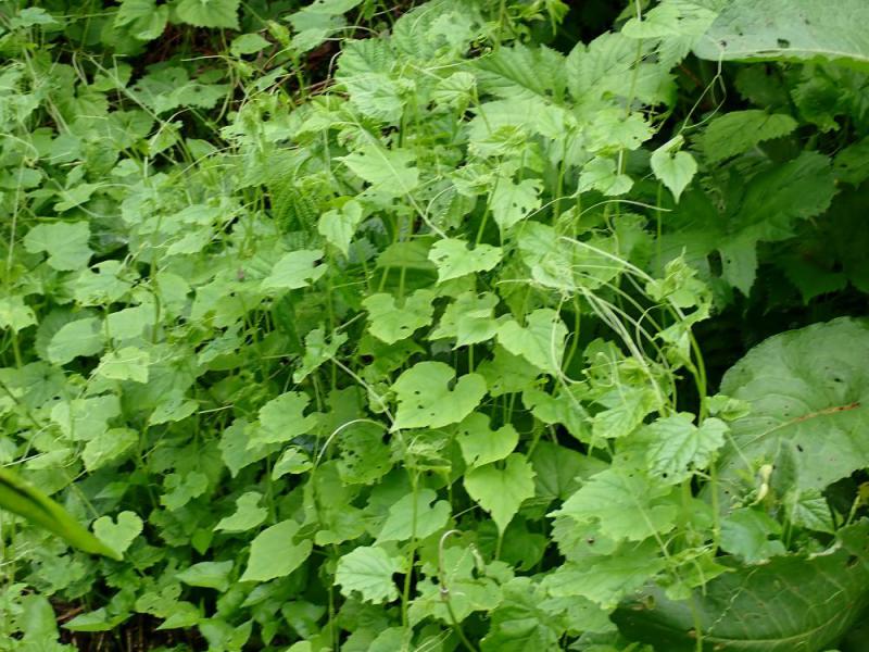 一年生草で巻きつる性のミヤマニガウリの群生。