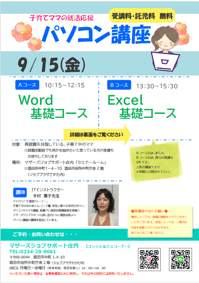 再就職応援『パソコン講座』のお知らせ ◇9月◇≪Aコース≫  9月15日(金)10:15〜12:15『Woed基礎コース』Wordを初めて使う方や、久しぶりの方を対象に基本的な機能と操作方法をお伝えします。表の作成や編集、文章の編集、印刷。表の作成などを行います!  ≪Bコース≫ 9月15日(金)13:30〜15:30『Excel基礎コース』Excelを初めて使う方や、久しぶりの方を対象に基本的な機能と操作方法をお伝えします。表の作成や編集、関数による計算、グラフの作成などを行います!♪片方のコースのみ、両方のコース、どちらの受講でも可能です♪ 【対 象】就職を目指している子育て中のママ※就職活動前で何かを始めたいママもOK【会 場】マザーズジョブサポート庄内 セミナールーム【料 金】受講料 及び 託児料 無料【託 児】 ※事前登録・予約が必要です。保育ルーム開室日【水・木・金】の 10:00〜16:00に登録にお越し下さい。 ※併設の保育ルームで、保育スタッフが お子さんをお預かりします。 ママは安心して受講いただけます。 【駐車場について】お車でお越しの際は、中町庁舎脇にあるセントラルホテル契約駐車場をご利用ください。(ジョブプラザさかたと表示してあります。)※契約駐車場が満車の場合は、酒田市中央地下駐車場をご利用ください。無料駐車券(最大2時間)を発行いたします。お帰りの際に、コンシェルジュ窓口へお声がけください。 ★★受講者の皆様へお願い★★場合によっては、体調の確認をさせていただくことがございます。状況によっては、ご案内の変更をさせていただきます。あらかじめご了承ください。★★ーーーーーーーーーーーー★★どうぞ、お気軽にお問い合わせくださいね。 ◇お申込み・お問い合わせ◇マザーズジョブサポート庄内TEL:0234-28-8061メールでのお申込みはコチラ