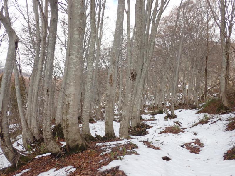 年には勝てない。努力はつきものだが玄海を感じる。ガイドのKさんがスノーシューを運んで頂く。本当に嬉しい限りである。残雪まばらの2次林です。林床には10cmぐらいの雪がありスノーシュー初滑りを楽しむ。しばし2次林の育ちと今後の成長の行方を談義する。原生林にはなり得ない立地条件にと迷う。