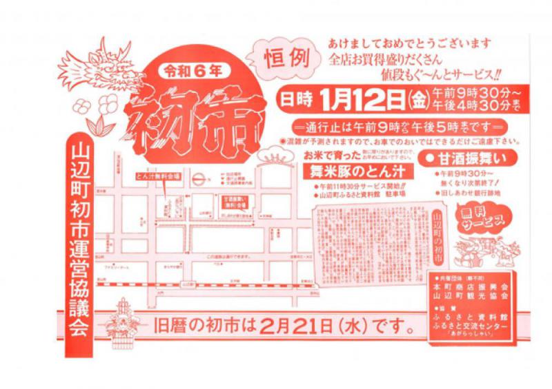 1月12日(金)は江戸時代より続く伝統行事「初市」を開催します。本町通りに、縁起物のだんご木や初あめ、木工品等の露店が立ち並びます。今年は舞米豚のとん汁と甘酒の無料振舞いも行わます。皆さまのお越しをお待ちしております(^^)/なお、旧暦初市は2月21日(水)に開催いたします。 日時:令和6年1月12日(金)時間:午前9時30分〜午後4時30分 甘酒の無料振舞い 9:30〜 舞米豚のとん汁無料振舞い 11:30〜場所:本町通りお問い合わせ:山辺町初市運営協議会 023-664-5939(商工会内)