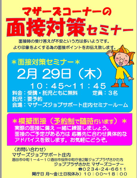2月マザーズジョブサポート庄内  求職支援セミナー『マザーズコーナーの  面接対策セミナー』 を行います!  このセミナーは 「面接は久しぶりなので不安だなぁ」 「子どもに関する質問に  どう答えればいいんだろう?」 面接が心配or苦手…  という方におすすめ! 面接への不安を解消するために より印象をよくする為のふるまいや 受け答えについてポイントをお伝え します。   ハローワークマザーズコーナーでは 定期的にセミナーを開催します。 奮ってご参加下さい。 受講後も疑問点など、 窓口にてご相談が受けられます。 【日 時】 2月29日(木) 10時45分〜11時45分【対 象】 お仕事探し中の子育てママさん【会 場】 マザーズジョブサポート庄内  セミナールーム【料 金】 受講料 及び 託児料 無料 ※お申込みが必要です。【託 児】 ※事前登録・予約が必要です。 ※併設の保育ルームで、保育スタッフが お子さんをお預かりします。 ママは安心して受講いただけます。                【駐車場について】 お車でお越しの際は、中町庁舎脇にある   セントラルホテル契約駐車場をご利用ください。 (ジョブプラザさかたと表示してあります。) ※契約駐車場が満車の場合は、 酒田市中央地下駐車場をご利用ください。 ご利用の方は、無料駐車券を(最大2時間) を発行いたします。 お帰りの際に、マザーズ窓口へお声がけください。※模擬面接 (予約制で随時行います) 面接のご予定がある方は応募先に合わせ具体的な アドバイスを致します。  どうぞ、お気軽にお問い合わせくださいね。  ◇お申込み・お問い合わせ◇ マザーズジョブサポート庄内 TEL:0234-24-6611(ハローワークマザーズコーナー) TEL:0234-28-8061(コンシェルジュコーナー)