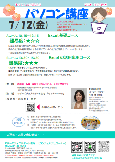 再就職応援『パソコン講座』のお知らせ 7月12日(金)≪Aコース≫ 10:15〜12:15『Excel基礎コース』Excelを初めて使う方や、久しぶりの方を対象に基本的な機能と操作方法をお伝えします。表の作成や編集、関数による計算、グラフの作成などを行います! ≪Bコース≫ 13:30〜15:30『Excelの活用応用コース!』「見やすい表を手早く作る」コツを学びます。実務を意識して、請求書の作り方や書類の管理のし仕方で役立つ情報も学べます。知っているだけで毎日の業務が変わる仕事ワザをマスターしましょう。 ♪片方のコースのみ、両方のコース、どちらの受講でも可能です♪ 【対 象】就職を目指している子育て中のママ※就職活動前で何かを始めたいママもOK【会 場】マザーズジョブサポート庄内 セミナールーム【料 金】受講料 及び 託児料 無料【託 児】 ※事前登録・予約が必要です。 保育ルーム開室日【水・木・金】の 10:00〜16:00に登録にお越し下さい。 ※併設の保育ルームで、保育スタッフが お子さんをお預かりします。 ママは安心して受講いただけます。 【駐車場について】お車でお越しの際は、中町庁舎脇にあるセントラルホテル契約駐車場をご利用ください。(ジョブプラザさかたと表示してあります。)※契約駐車場が満車の場合は、酒田市中央地下駐車場をご利用ください。無料駐車券(最大2時間)を発行いたします。お帰りの際に、コンシェルジュ窓口へお声がけください。 どうぞ、お気軽にお問い合わせくださいね。 ◇お申込み・お問い合わせ◇マザーズジョブサポート庄内TEL:0234-28-8061メールでのお申込みはコチラ