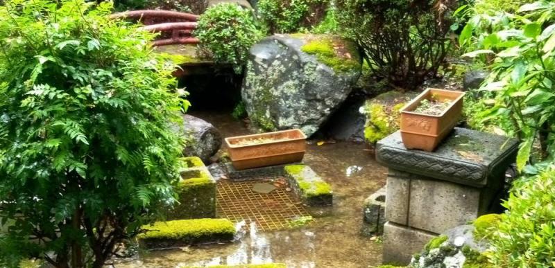 今日の午前中は雨が強く、いつもは水が漏れて、まったくないのですが、今はご覧の通りです。金魚も壺の中から出て、嬉しそうに広い池の中を泳ぎ回っていました。こんなにたまった水も、半日もしないうちに無くなってしまいます。