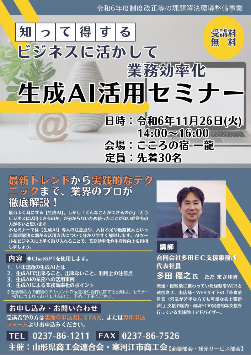 令和6年度制度改正等の課題解決環境整備事業「生成AI活用セミナー」を開催いたします。 最新トレンドから実践的なテクニックまで、業界のプロが徹底解説! 最近よく耳にする「生成AI」。しかし「どんなことができるのか」「どうビジネスに活用できるのか」が分からないため使ったことがない経営者の方が多いと思います。 本セミナーでは「生成AI」導入の注意点や、人材不足や販路拡大といった課題解決に繋がる活用方法について分かりやすく解説します。AIツールをビジネスに上手く取り入れることで、業務効率化や生産性向上を目指しましょう。 ■日時令和6年11月26日(火)14:00〜16:00 ■会場こころの宿一龍 ■定員先着30名 ■講師合同会社多田EC支援事務所 代表社員 多田 優之 氏 ■内容1.いま話題の生成AIとは2.生成AIで出来ること、出来ないこと、利用上の注意点3.生成AIの業務への活用事例4.生成AIによる業務効率化のポイント※ChatGPTを使用します。※受講者の方の個別のアカウント作成支援や操作に関する説明は、セミナー内容に含まれておりませんので、予めご了承ください。 ■お申込み下記URLより申込フォームにアクセスしお申込みください。Googleフォームへのリンク:https://x.gd/rYHuy