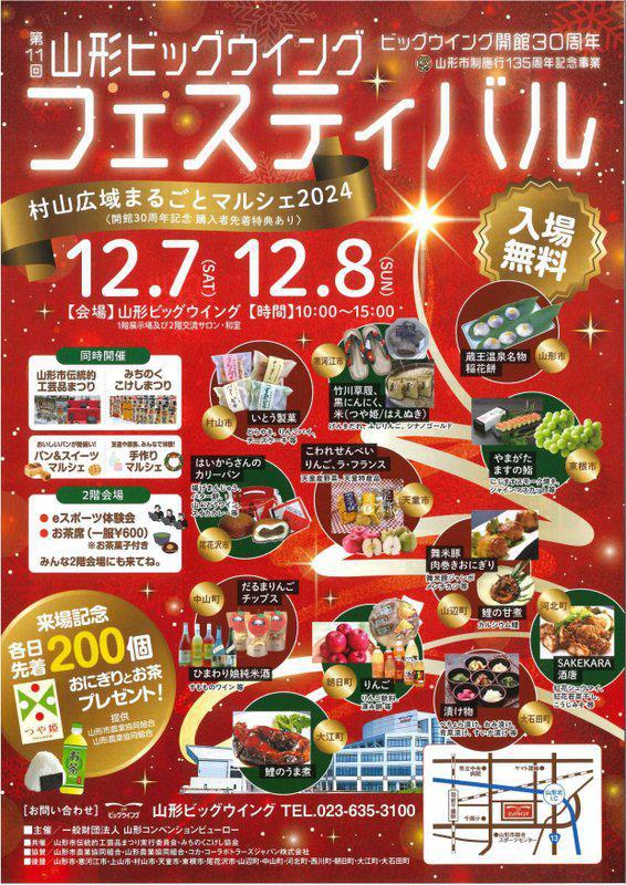 12月7日(土)・8日(日)は「山形ビックウイングフェスティバル」を開催します。山辺町からは、舞米豚を使った肉巻きおにぎりやメンチカツ、要害産の鯉の甘煮等を販売します。同時に「山形市伝統的工芸品まつり」「みちのくこけしまつり」「パンマルシェ」「手作りマルシェ」も開催します。先着で来場記念もあります。ぜひお越しください。 日時:12月7日(土)・8日(日)   10:00〜15:00場所:山形ビックウイング