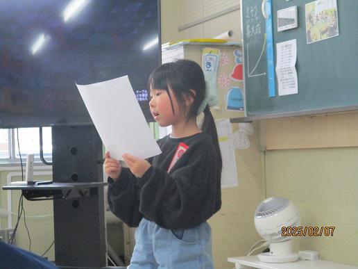1年生、1年間で自分が成長したことや頑張ったことの発表。字を覚えて、作文を書いて発表できるようなったということ自体、大進歩です。 2年生、親子で直方体(箱)作り。自分たちだけの箱、うまくできたかな? お家の方がそばにいて、いつもよりにこにこ顔での授業。一人一人、しっかり力をつけて・・・。 5年生、お家の方々に問題作り。さすがにはりきっていますね!お父さん、お母さんは、後ろでドキドキのようでした。 4年生、教室と音楽室の2段構え。考えていることやできたことをお見せできました。 3年生、回文作り。頭を柔らかくしないと、思いつきません。みんなで、脳のブラッシュアップでしたね。 家での顔、教室での顔、習い事の場での青、子どもたちも様々な顔があります。新たな一面の発見もあったのではないでしょうか。 1年間で、ほぼ体の細胞も生まれ変わると言います。92名、また大人になったところを感じていただければ幸いです。
