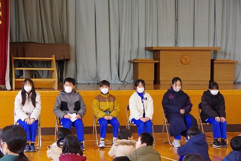 今朝は、児童会引き継ぎ式。今までの委員長と来年度の委員長から挨拶がありました。 司会のKさんが、順番にスピーチをお願いしています。 さすが運営委員長。1年間仕事をやってきた貫禄で、後輩への期待を話しました。 生活委員長。こぐわっ子たちの健康管理や給食、生活全般について学校を回す歯車となって活躍しました。 体育委員長。全校生の前でもほめましたが、先生方が気付く前に行動し、本当の意味での自治活動を見せました。 図書委員長。ラストスパート、2月の後半になってもしっかり活動をしています。体育委員会とともに図書委員会も名前は消えますが、来年度に願いを託しました。 暑い日も雨の日も、雪の日も、空き缶回収や学校の掃除をしたエコボランティア委員会。しっかりードしたAさんです。 昼の放送で新企画を考えたり、後輩指導をきっちり行い、育てたIさん。他の6年生の姿も、Iさん同様でした。 新運営委員長。 新生活委員長 新環境委員長 新放送委員長 4人とも、来年度の決意を、6年生と同様原稿なしで話しました。 2人の気持ち、はっきり見えます。 こぐわっ子たちの児童会の自慢について、あらためて伝えました。6年生がリードしてきたことを受け継いで、また更にグレードアップした児童会にしてくれることでしょう!