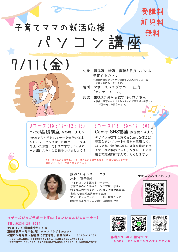 ☆マザーズジョブサポート庄内主催☆毎回大人気!『パソコン講座』のお知らせ ≪Aコース≫ 7月11日(金)10:15〜12:15『Excel基礎講座』難易度★★☆Excelでよく使われるデータ集計の基本から、テーブル機能、ピボットテーブルを使った集計・分析まで学び、Excelデータ集計スキルに自信をつけましょう♪ ≪Bコース≫ 7月11日(金)13:30〜15:30『Canva SNS講座』難易度★★☆デザインが苦手な方でもCanvaを使えば豊富なテンプレートや素材を活用して、おしゃれで魅力的なSNS画像が作成できます。基本操作からテンプレートの活用まで実践的に学んでいただけます♪♪片方のコースのみ、両方のコース、どちらの受講でも可能です♪【対 象】再就職・転職・復職を目指している子育て中のママ※就職活動前で何かを始めたいママもOK【会 場】マザーズジョブサポート庄内 セミナールーム【料 金】受講料 及び 託児料 無料【託 児】※事前登録・予約が必要です。 保育ルーム開室日【水・木・金】の 10:00〜16:00に登録にお越し下さい。 ※併設の保育ルームで、保育スタッフが お子さんをお預かりします。 ママは安心して受講いただけます。 【駐車場について】お車でお越しの際は、中町庁舎脇にあるセントラルホテル契約駐車場をご利用ください。(ジョブプラザさかたと表示してあります。)※契約駐車場が満車の場合は、酒田市中央地下駐車場をご利用ください。無料駐車券(最大2時間)を発行いたします。お帰りの際に、コンシェルジュ窓口へお声がけください。どうぞ、お気軽にお問い合わせくださいね。☆★☆コンシェルジュコーナーでLINEアカウントやっております♪ ☆★☆セミナーのお知らせや、お問い合わせ、お申込みにも対応しています♪ぜひお友達になってください☆https://lin.ee/zBnhdYULINEの場合は「お名前、電話番号、申込み講座、託児の有無」を送信して返信をお待ちください ◇お申込み・お問い合わせ◇マザーズジョブサポート庄内TEL:0234-28-8061メールでのお申込みはコチラマザーズジョブサポート庄内コンシェルジュコーナーからの返信をもって申込受付完了となります