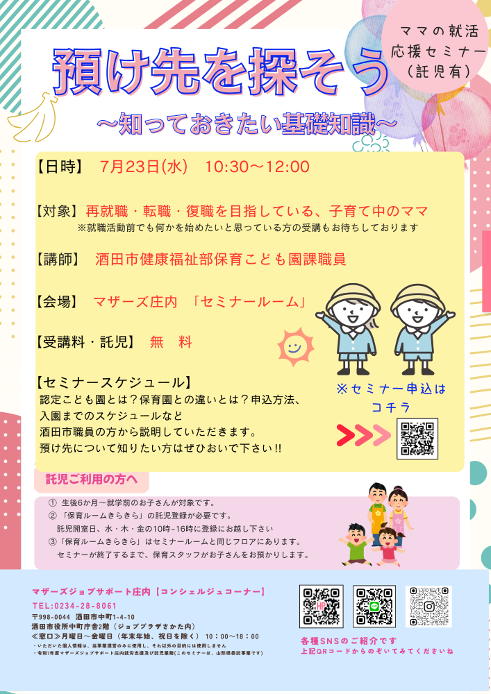 ☆マザーズジョブサポート庄内主催☆「預け先を探そう」〜知っておきたい基礎知識〜のお知らせです。 認定こども園とは?保育園との違いとは?申込方法、入園までのスケジュールなど酒田市職員の方から説明していただきます。預け先について知りたい方はぜひおいで下さい!! 【日 時】7月23日(水)10時30分〜12時00分 【対 象】再就職・転職・復職を目指している子育て中のママ※就職活動前で何かを始めたい方でもOK【会 場】マザーズジョブサポート庄内 セミナールーム【料 金】受講料 及び 託児料 無料【託 児】※事前登録・予約が必要です。ご利用希望の方はお問合せください。保育ルーム開室日【水・木・金】の10:00〜16:00に登録が必要となります。 ※併設の保育ルームで、保育スタッフが お子さんをお預かりします。 ママは安心して受講いただけます。          【駐車場について】お車でお越しの際は、中町庁舎脇にある〈セントラルホテル契約駐車場〉をご利用ください。(ジョブプラザさかたと表示してあります。)※契約駐車場が満車の場合は、酒田市中央地下駐車場をご利用ください。無料駐車券(最大2時間)を発行いたします。 どうぞ、お気軽にお問い合わせくださいね。☆★☆コンシェルジュコーナーでLINEアカウントやっております♪              ☆★☆セミナーのお知らせや、お問い合わせ、お申込みにも対応しています♪ぜひお友達になってください☆https://lin.ee/zBnhdYULINEの場合は「お名前、電話番号、申込み講座、託児の有無」を送信して返信をお待ちください ◇お申込み・お問い合わせ◇マザーズジョブサポート庄内TEL:0234-28-8061メールでのお申込みはコチラマザーズジョブサポート庄内コンシェルジュコーナーからの返信をもって申込受付完了となります