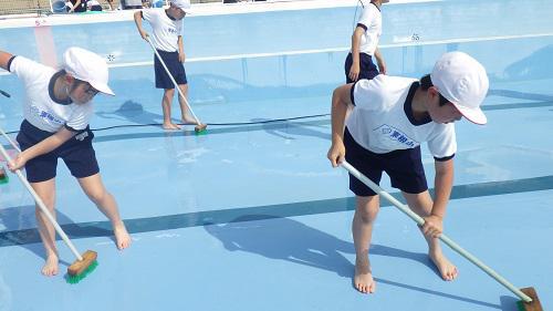 6月2日(月)、来週行われるプール開きに向けて、プール清掃が行われました。4〜6年生の子供たちの力を借りて1年間の汚れを洗い流してもらったプールは、心なしか嬉しそうに見えます。6月3日(火)には、本校の級外の先生方と町内小中学校の業務技術員さんに協力いただき、プール壁面の塗装を行いました。現在、プールには水が張られ、プール開きを待つばかりです。今年の夏も暑くなりそうですが、熱中症に気を付けながら、きれいなプールで楽しい学習ができそうです。子供たちにも、先生方、業務技術員さんにも感謝です。