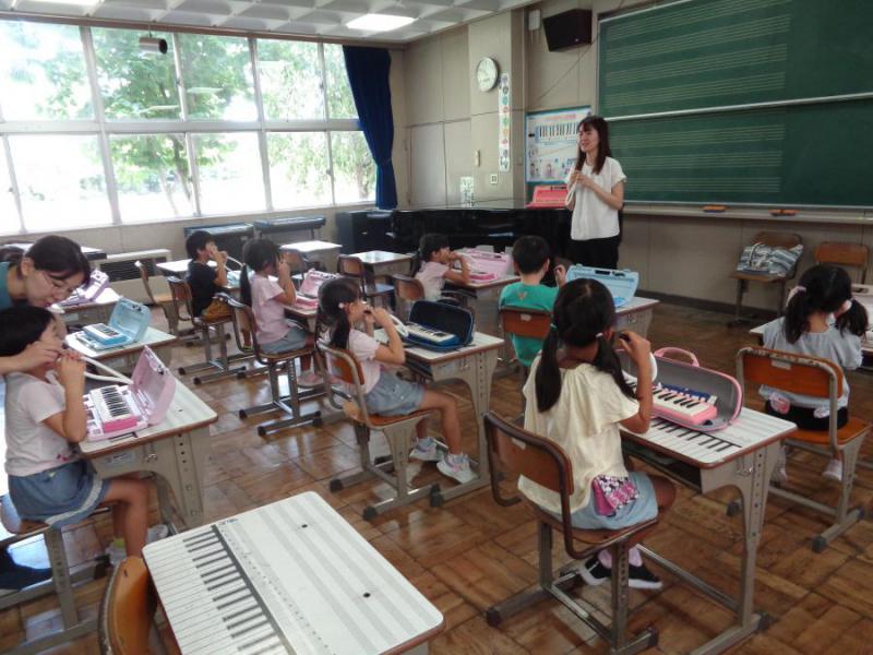 今日は、1年生のメロディオン講習会が行われました。「メロディオン」というより鍵盤ハーモニカと言った方がわかりやすかもしれませんね。専門の講師の方をお招きして、扱い方や基本的の使い方などを丁寧に指導していただきました。吹き口から息を吹き込んでみると…、ホースの先から空気が勢いよく飛び出します。続いては、ホースの先を耳に当てて小声で話してみると…、よく聞こえたようです。しっかりと音を出すための基本ですね。話の聞き方が上手な1年生ですので、約束事や大切なことをしっかり覚えられたことでしょう。これから長く使っていくことになります。メロディオンと仲良くなって、きれいなメロディーを奏でられようになることを願います。11月の学習発表会あたりで1年生の演奏を聴くことができるかもしれませんね。楽しみにしたいと思います。