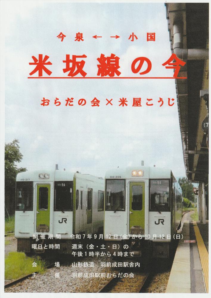 駅茶では9月12日から、米屋こうじさんと共同で『米坂線の今(今泉←→小国)』展を行います。 米坂線は2022年8月の豪雨で、米沢〜今泉間を除いて運休となっています。米坂線復旧の願いを込めて8月31日には第2回米坂線復活絆祭りが関川村で開催されました。また今月27、28日には、米沢駅から坂町駅までの約90キロを2日間かけて歩くイベントも計画されているとのことです。 こうした運動に対する応援の意味も含めて、おらだの会では今泉駅から小国駅までの8駅の現在の姿を紹介すると共に、写真家米屋こうじさんが若い頃に撮られた米坂線の鉄道風景写真を展示します。鉄路と駅舎に刻まれた歴史、沿線住民の思いの痕跡を辿りながら、山形鉄道のこれからにも思いを馳せたいと考えています。ぜひご覧ください。  『米坂線の今 (今泉←→小国)』  開催期間  9月12日(金)から10月12日(日)        上記期間の各週末(金・土・日)  開場時間  午後1時半から4時まで