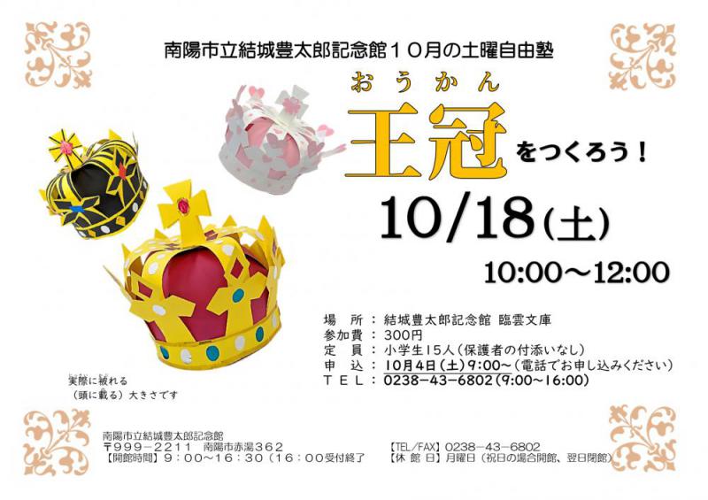 土曜自由塾は、6月〜12月の第4土曜日(変更あり)に行う小学生を対象とした講座です。つくるものは決まっていますが、その中で自分の好きなようにのびのびと楽しくつくります。≪定員に達しましたので受付を終了いたします≫ 10月の土曜自由塾は 王冠をつくろう! です。画用紙を使って実際に被れるサイズの王冠をつくります。申 込:10月4日(土)9:00から受付開始(電話でお申し込みください)TEL:0238−43−6802(9:00〜16:00)※定員(小学生15人)になり次第締切※熱や咳など体調不良がある場合は参加をご遠慮ください。 9月の土曜自由塾つくってあそぼう!ミニ空気砲、無事に終わりました。作り終わった後に、更に自分たちでアレンジを加えたりなど、自由な発想が見られました。もちろん、その後は作ったミニ空気砲で時間いっぱい遊びました!