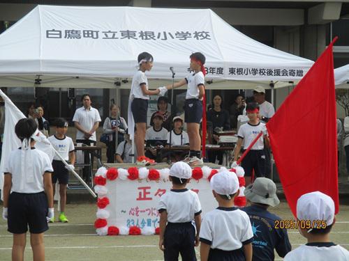 9月25日(木)、お天気が心配されましたが、無事に東根小学校大運動会を開催することができました。先日までの子ども達の気合を切らすことなく運動会を開催してあげたいという職員の思いと、子供たちの頑張りが天に届いたのだと思います。一時は強く降った雨も開会前には止み、涼しい気温の中、すべての競技を行うことができました。 開会式で、子供たちには「自分の目標に向かって、一人一人が自分の力を出し切って、精一杯頑張る姿を見せてほしい。」と話しました。運動会までの数週間、体育の時間や休み時間、放課後学校に来てまで練習している子供たちの姿を見てきました。結果は優勝・応援賞とも赤組、準優勝白組、というものでしたが、一人一人が全力を出し切って正々堂々と戦った結果です。当日の頑張りはもちろん、練習から頑張りぬいた子供たちに、「精一杯頑張る姿を見せてくれてありがとう。」という思いでいっぱいになりました。かわいい1年生のご挨拶。大きな声ではきはきと話せました。両軍組頭の凛々しい姿です。組み全体をどんな風にまとめようか、どんな言葉で伝えようかと、一生懸命考えて行動に移してくれた2人です。今年度のスローガンの通り、正々堂々とした開会宣言でした。クーリングタイム前の競技は各学年の徒競走でした。練習の成果が自信となって表れた走りでした。