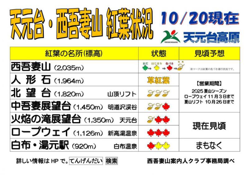 天元台・西吾妻山の「紅葉」最新情報です!現在ロープウェイから眺める紅葉が見頃です!白布温泉周辺もかなり色付いてまいりました。見頃の予想を参考に是非色鮮やかな紅葉を鑑賞してみてください!※ロープウェイは11月3日(月・祝)まで営業しています!【お問い合わせ】天元台高原 TEL:0238-55-2236