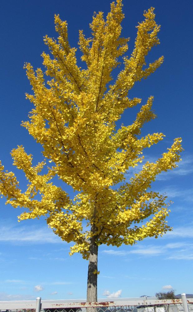 ●イチョウの葉が秋のやわらかな陽ざしをあびて黄色に輝いてすくっと立っています 青い空にはぴったりの木で 空には絵筆でなぞった様に薄い雲が浮かんでいます 地区内のそちこちで見つけ撮りました 日増しに周りの山が色づき秋がどんどんと深まってきます