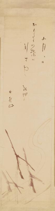 「おもだかの」発句自画賛 与謝蕪村 筆 1幅 宝暦八‐明和初年(1758‐66) 山寺芭蕉記念館蔵 文月八日おもだかの橋は 引ずや銀河 蕪村(花押) 〔解 説〕 蕪村の宝暦から明和初年の筆跡の特徴がよく表れている作品。沢瀉(おもだか)は水田に生える多年草。池辺の沢瀉の影が、昨夜の七夕には水面に映える天の川に渡す橋かと思えたが、八日の今日も昨夜の名残りを偲ばせつつ、季節を過ぎて衰残の姿をされしているさまを、句・画両面から利かせたもの。