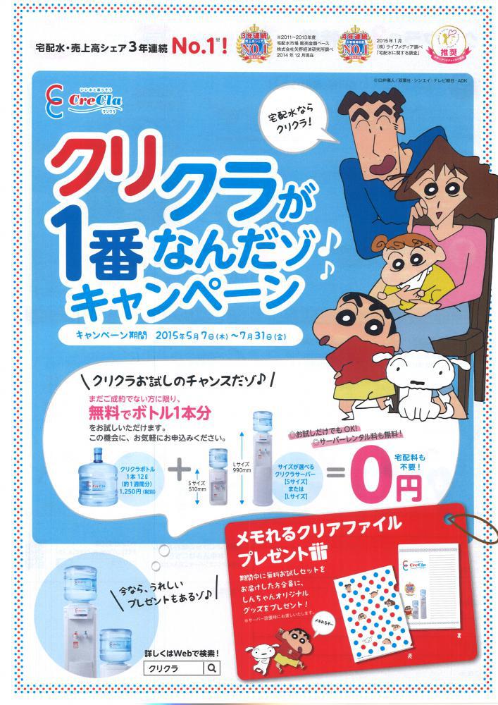 クリクラのお試しキャンペーンが始まりました♪その名も、「クリクラが一番なんだゾ♪」 キャンペーン ( ´ ▽ ` )ノ 期間は・・・2015年5月7日(木) 〜2015年7月31日(金) 期間中に無料お試しセットをお届けした方にもれなくしんちゃんのクリアファイル も プレゼント!! 以前から、しんちゃんのCMのお水が気になっていた!宅配水ってどういうお水??とお考えだった方は、お得にお試しができる今がチャンスです☆◎お試しだけでもOK! どうぞお見逃しなく!(^0^)/