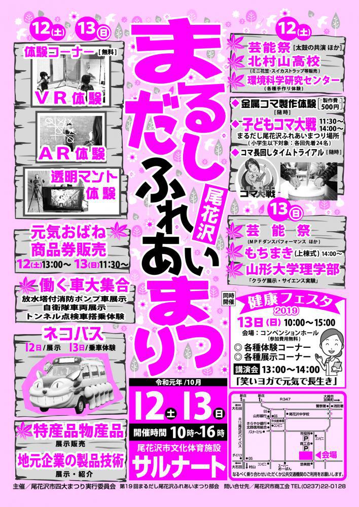 尾花沢市の特産品やおいしいもの、芸能、市内企業の製品・技術展示など、様々な魅力を一同に介したイベントです。 今回の目玉は最新技術が体験できる「VR・AR体験、透明マント体験」(参加無料)となっております。バーチャルな世界を体験してみてはいかがですか。他にも消防車・自衛隊などの「働く車大集合」(両日)、「金属コマ製作体験・トーナメント大会」(12日)、同時開催で「健康フェスタ2019」(13日)など盛りだくさんの内容となっております。 10月12日・13日はぜひ、まるだし尾花沢ふれあいまつりにお越しください!お待ちしております。 期 日:令和元年10月12日(土)、13日(日) 両日ともに午前10時〜午後4時会 場:尾花沢市文化体育施設サルナート(尾花沢市若葉町1-4-27)問合先:尾花沢市商工会  0237-22-0128